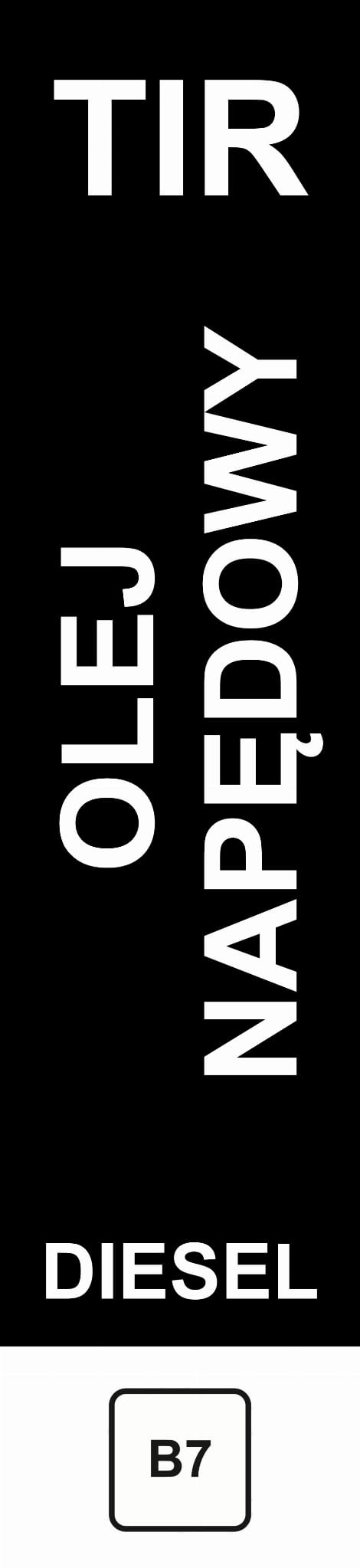 Naklejka pionowa na dystrybutor do umieszczenia nad pistoletem nalewczym z nazwą produktu Olej Napędowy Diesel TIR i kodem B7. Rozmiar 75 x 340 mm.